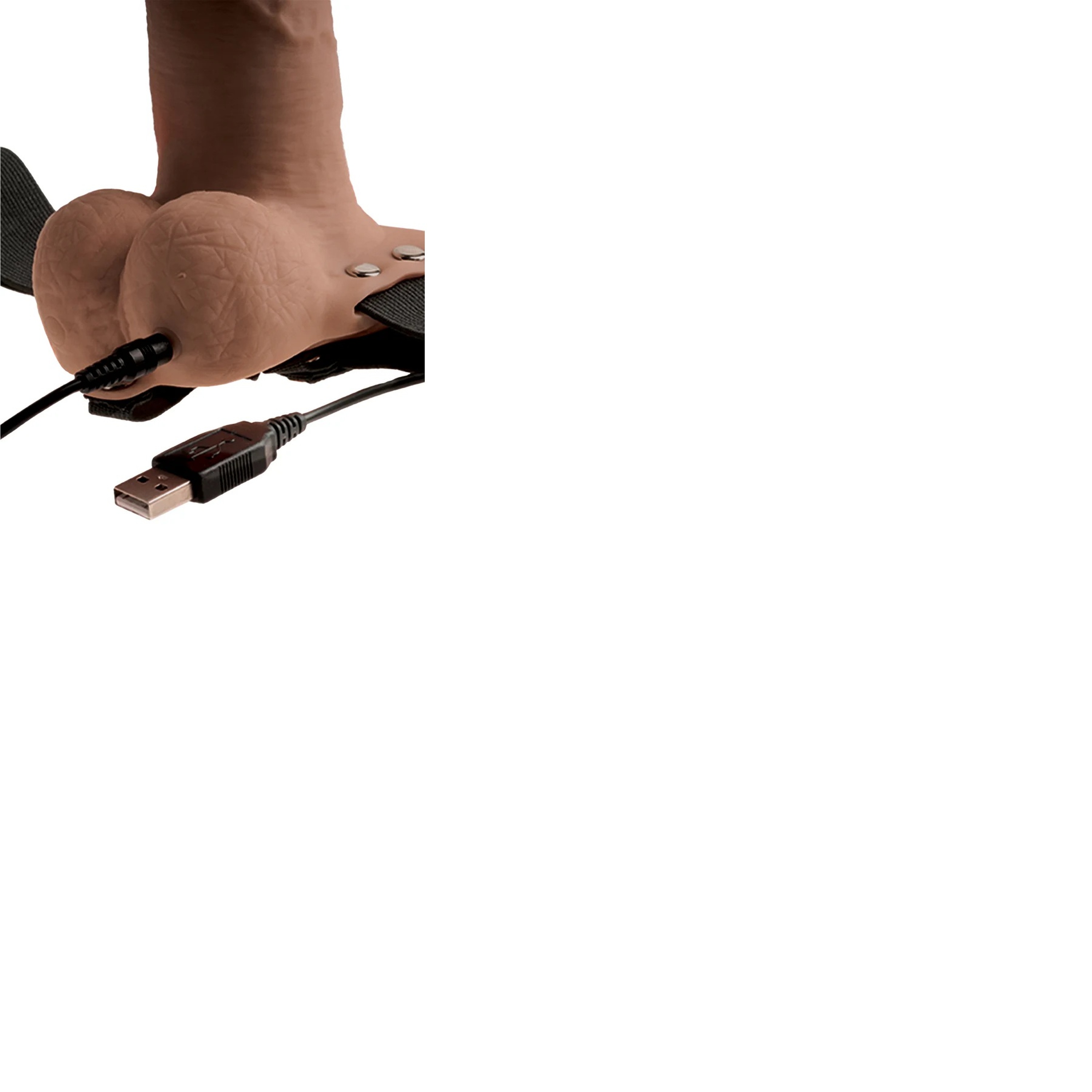 The rechargeable hollow strap-on is ready to go when you are and you’ll never have to worry about changing batteries again. Press and hold the button on the left testicle for three seconds to power on, then press the button again to cycle through ten thrilling pulsation patterns. Powered by a long-lasting lithium-ion battery, the super strong Japanese motor delivers thrilling, multi-speed vibrations at the tip of the dildo—precisely where your partner wants them most. The dildo is body-safe, latex-free, and compatible with both water-based and silicone-based lubricants. Cleanup is a snap after the fun with Pipedream toy cleaner and warm water. The included USB charging cord works with most USB power sources.