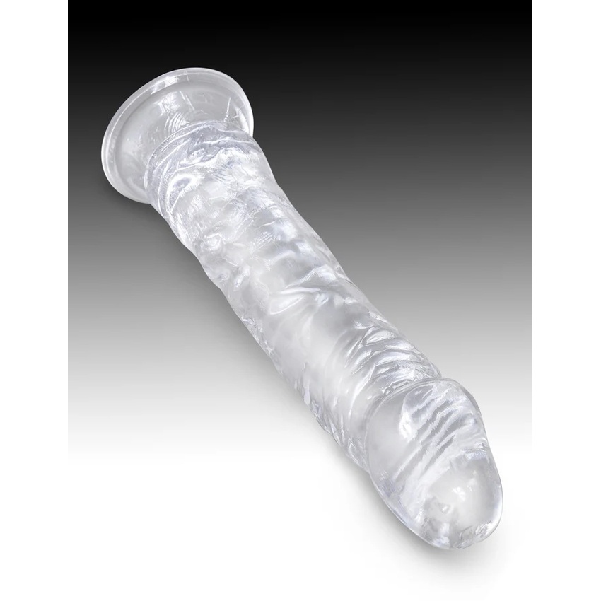 The King Cock® Clear 8 in. Dildo combines a translucent dildo with a realistic cock design: flexible shaft, detailed veins, and defined head. The powerful suction cup base sticks to nearly any flat surface and makes every dildo harness compatible.