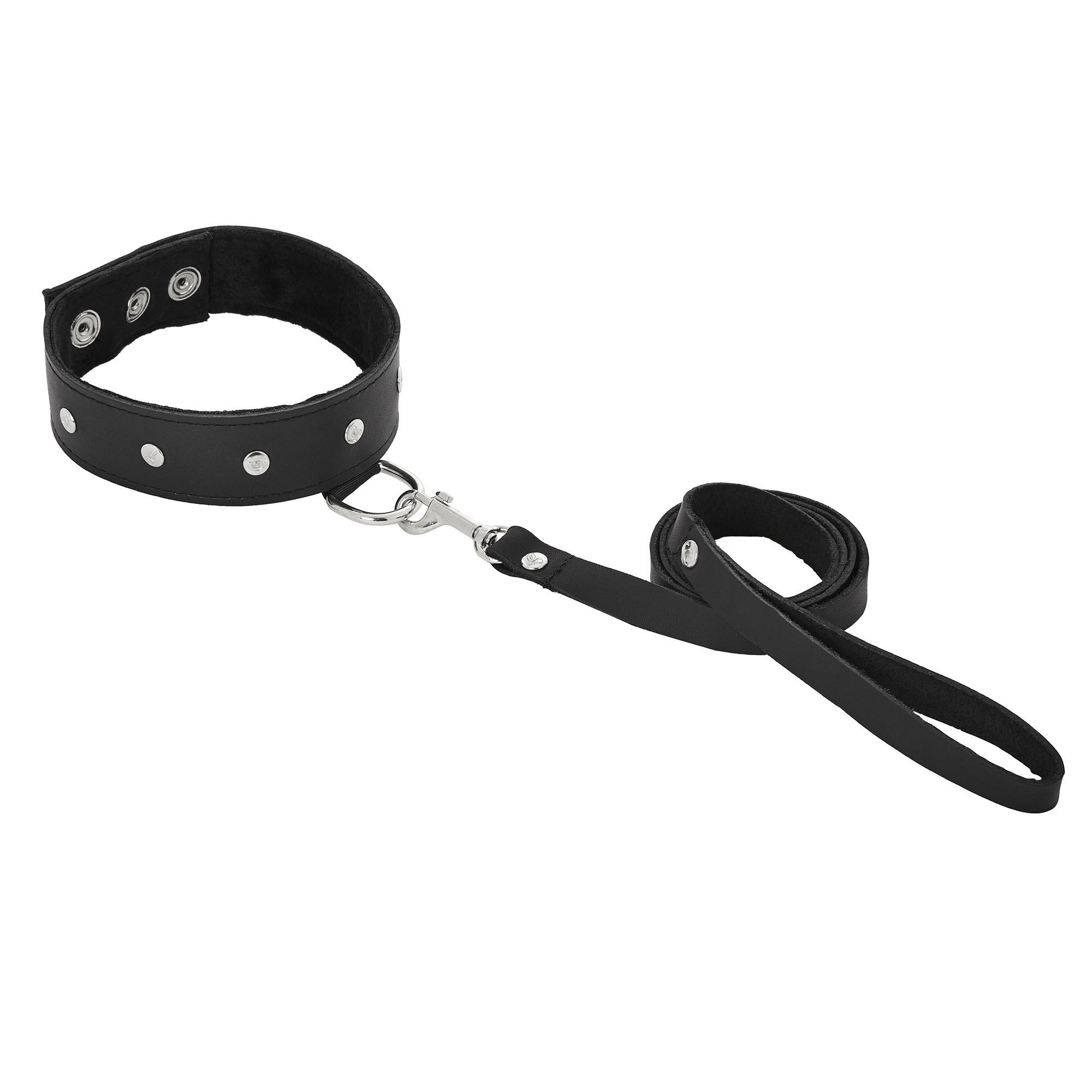 Keep them in check with a loop around their neck. This winsome collar girds and garnishes your victim in studded allure with high quality black leather, granting you 42 inches of leeway to guide, grip, and chastise your petulant pup as you see fit.