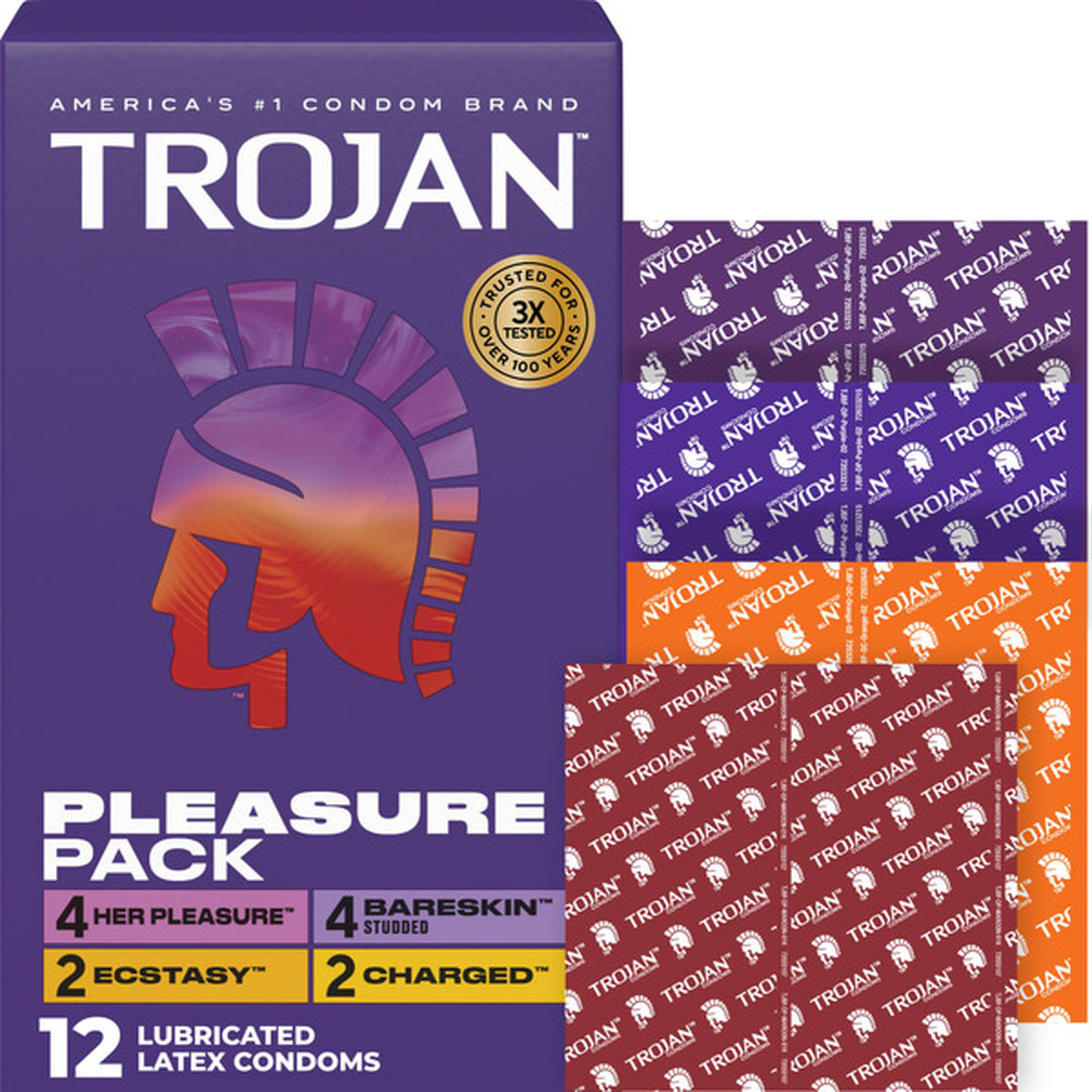 The Trojan Pleasure Pack has everything you need all in 1! Starting off with Trojan Twisted which is designed to stimulate both partners in their most sensitive areas. Trojan Sensations that are ribbed and contoured for extra enjoyment Trojan Intense for comfort and sensitivity and Fire And Ice with dual action lubricant and tingling sensations for the both of you! There are 12 condoms per package.