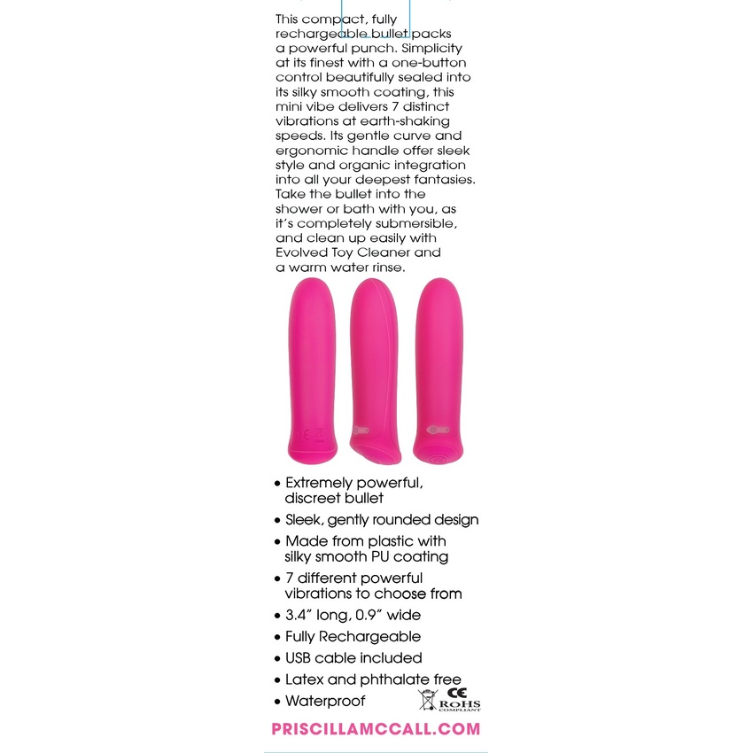 This compact fully rechargeable bullet packs a powerful punch. Simplicity at its finest with a one-button control beautifully sealed into its silky smooth coating, this mini-vibe delivers 7 distinct vibrations at earth-shaking speeds. Its gentle curve and ergonomic handle offer a sleek style and organic integration into all of your deepest fantasies. Take the bullet into the shower or bath with you as it’s completely submersible and clean up easily with Priscilla McCall's Toy Cleaner and a warm water rinse.