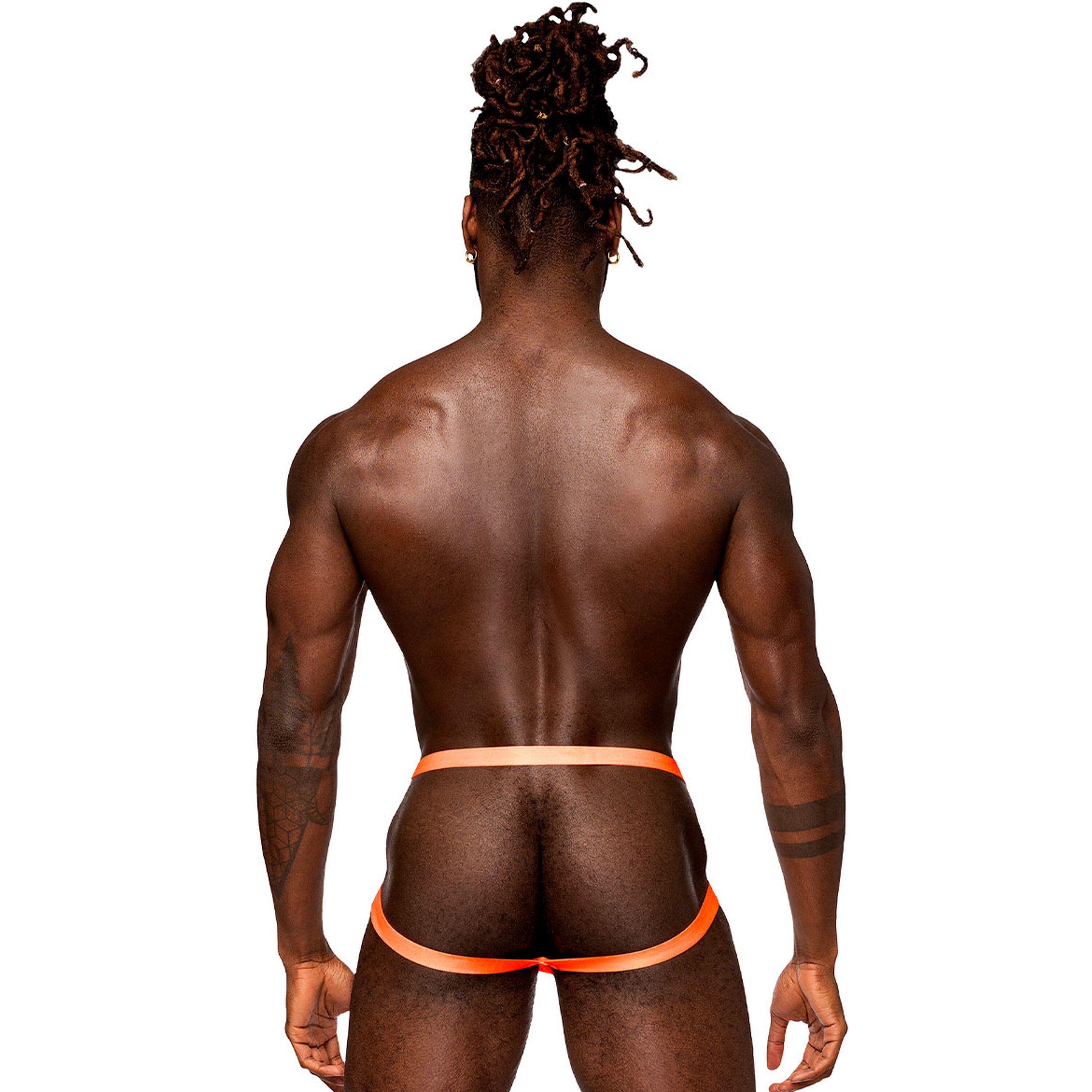 Amp up the sex appeal with this men's jockstrap featuring a striped design, O-ring accents, a strappy waistband, and an open back with booty framing straps.