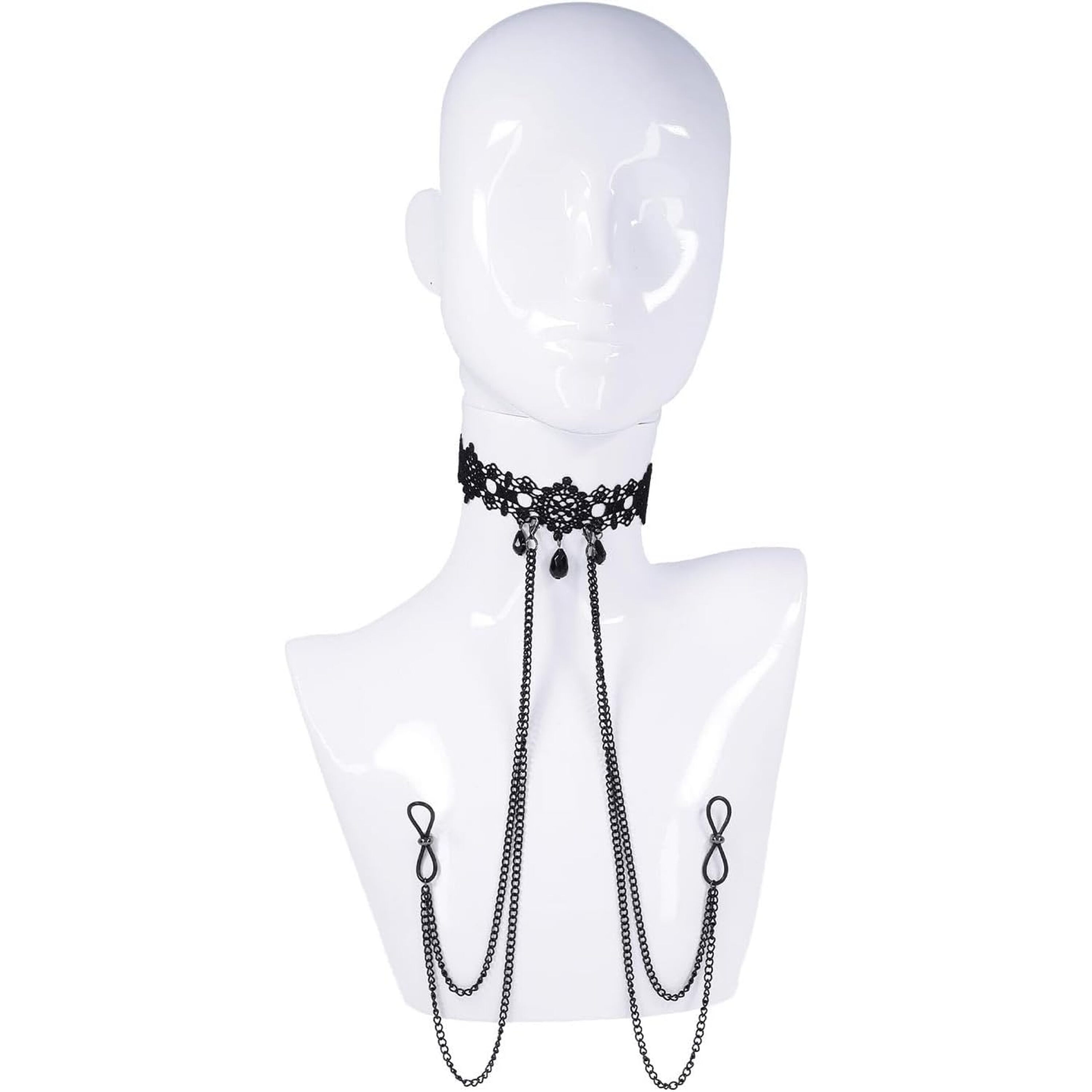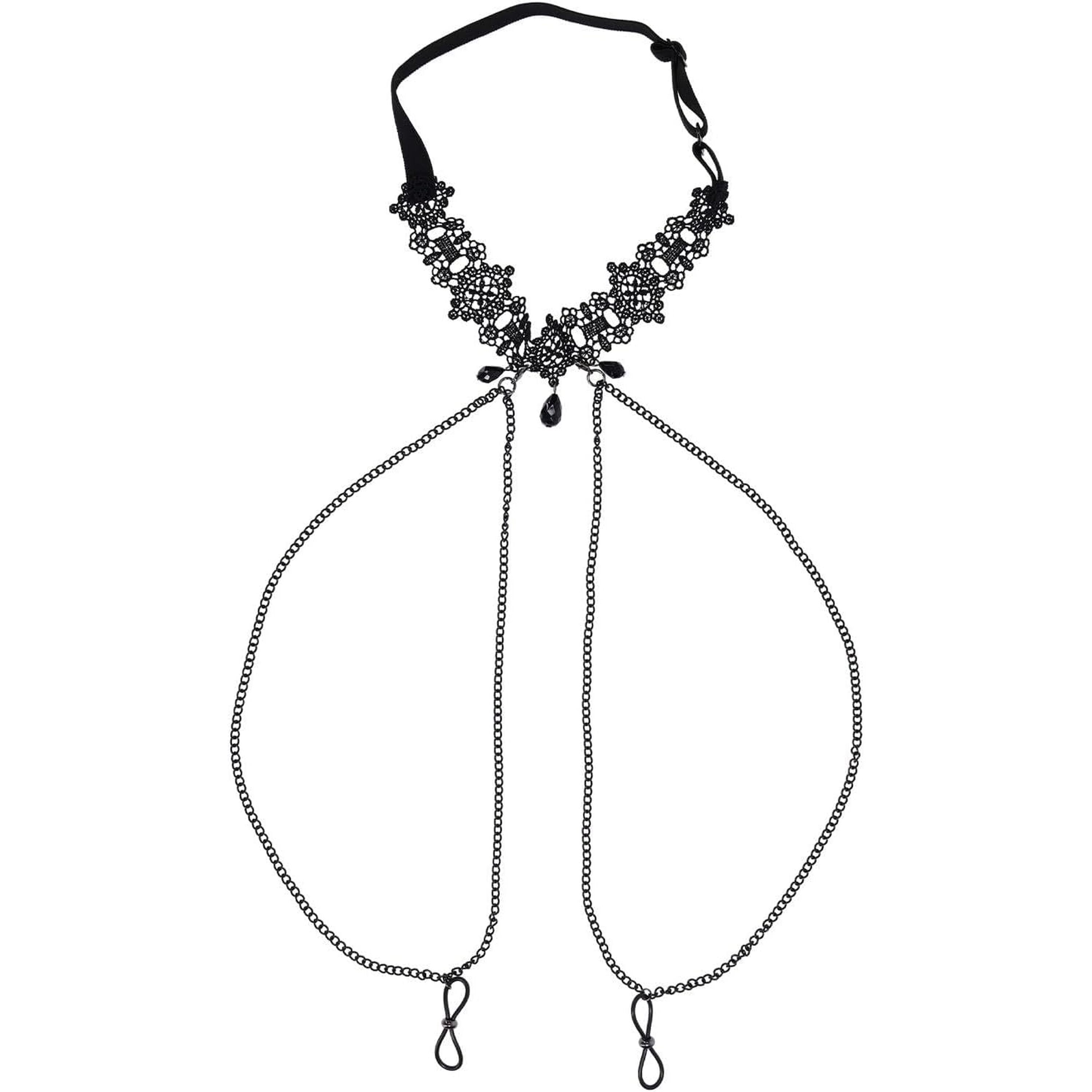 Dripping with dark elegance and sensual allure, the Lace Collar with Nipple Ties is designed for those who crave a touch of the unexpected. This ornate lace collar wraps comfortably around the neck, featuring an adjustable bra-strap-style back for the perfect fit. Glistening black gemstones dangle delicately from the collar, drawing attention to the neckline while adding a touch of mystery. The black dual draping chains connect effortlessly to adjustable nipple ties, offering a subtle yet seductive thrill. Designed to be stylish, sexy, and discreet, and perfect for those looking to turn up the heat whether in public or behind closed doors.