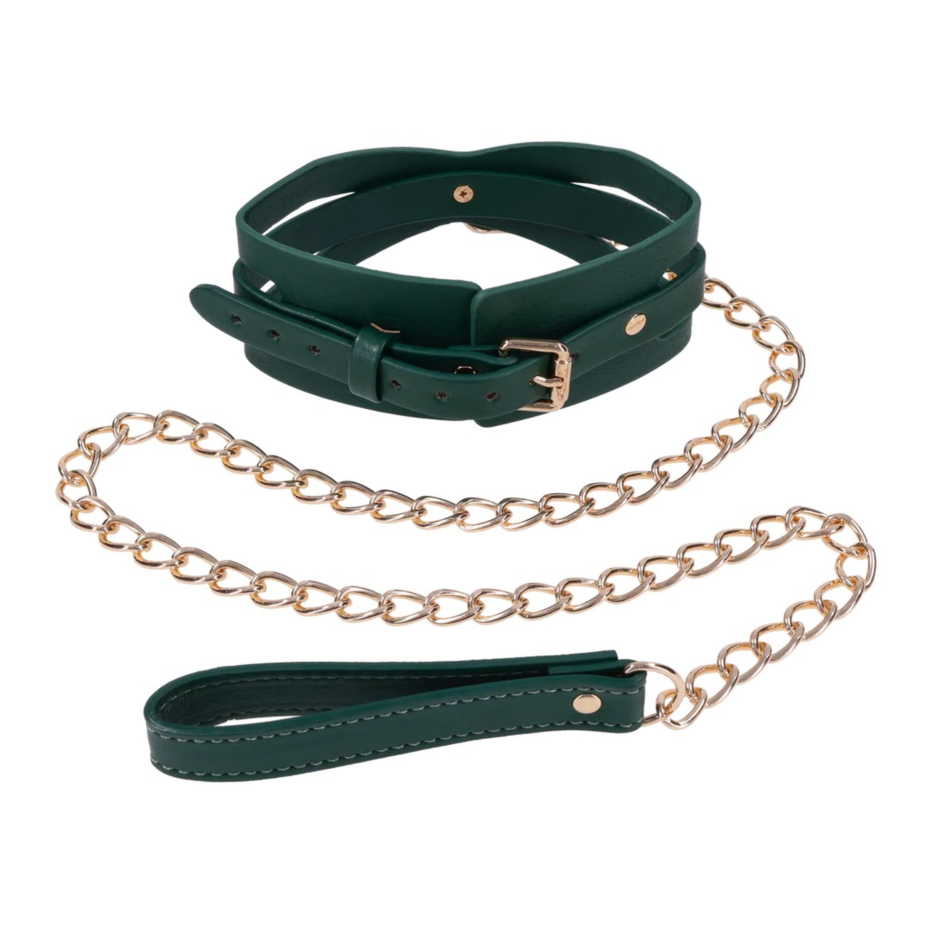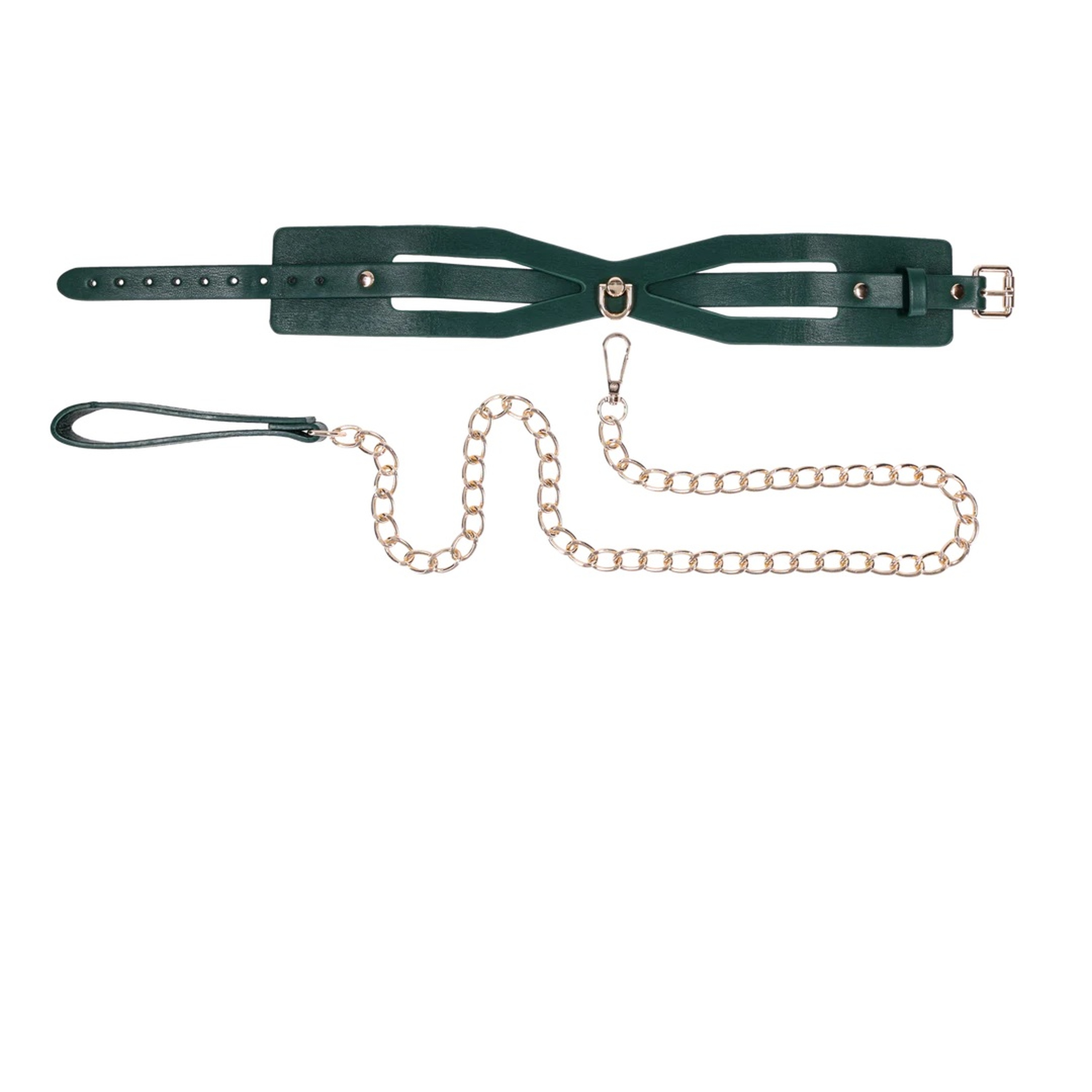 Surrender in style. The Indica Cutout Collar wraps the neck in rich emerald green with luxe gold hardware and sensual cutout accents that expose just enough skin. Lined for comfort, this collar is a soft but striking symbol of submission—an invitation to give in and give over. The coordinating gold chain leash with green handle lets your dominant guide the pace, whether you’re at home or on display. Pair with the Indica Cutout Cuffs for a beautifully bound look.