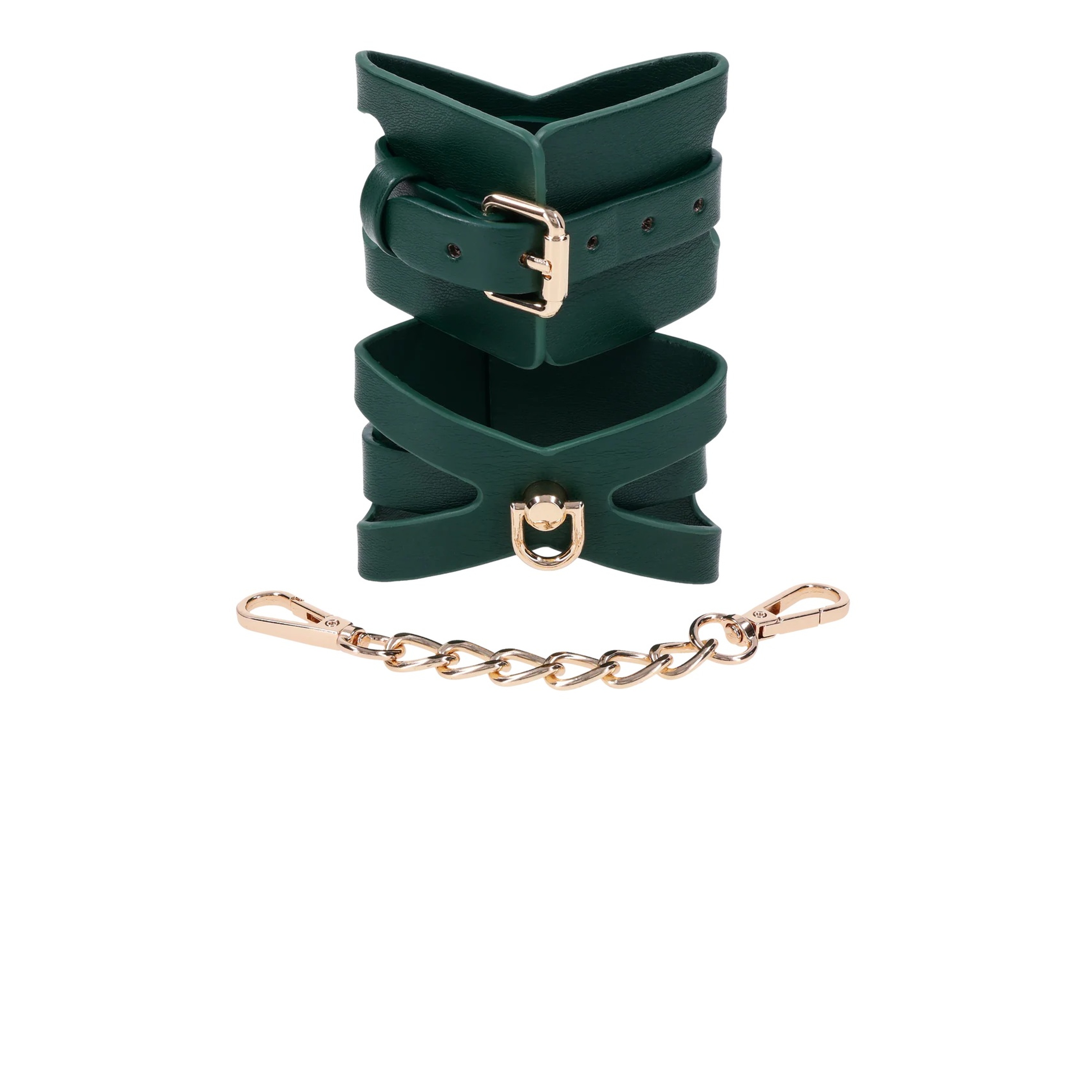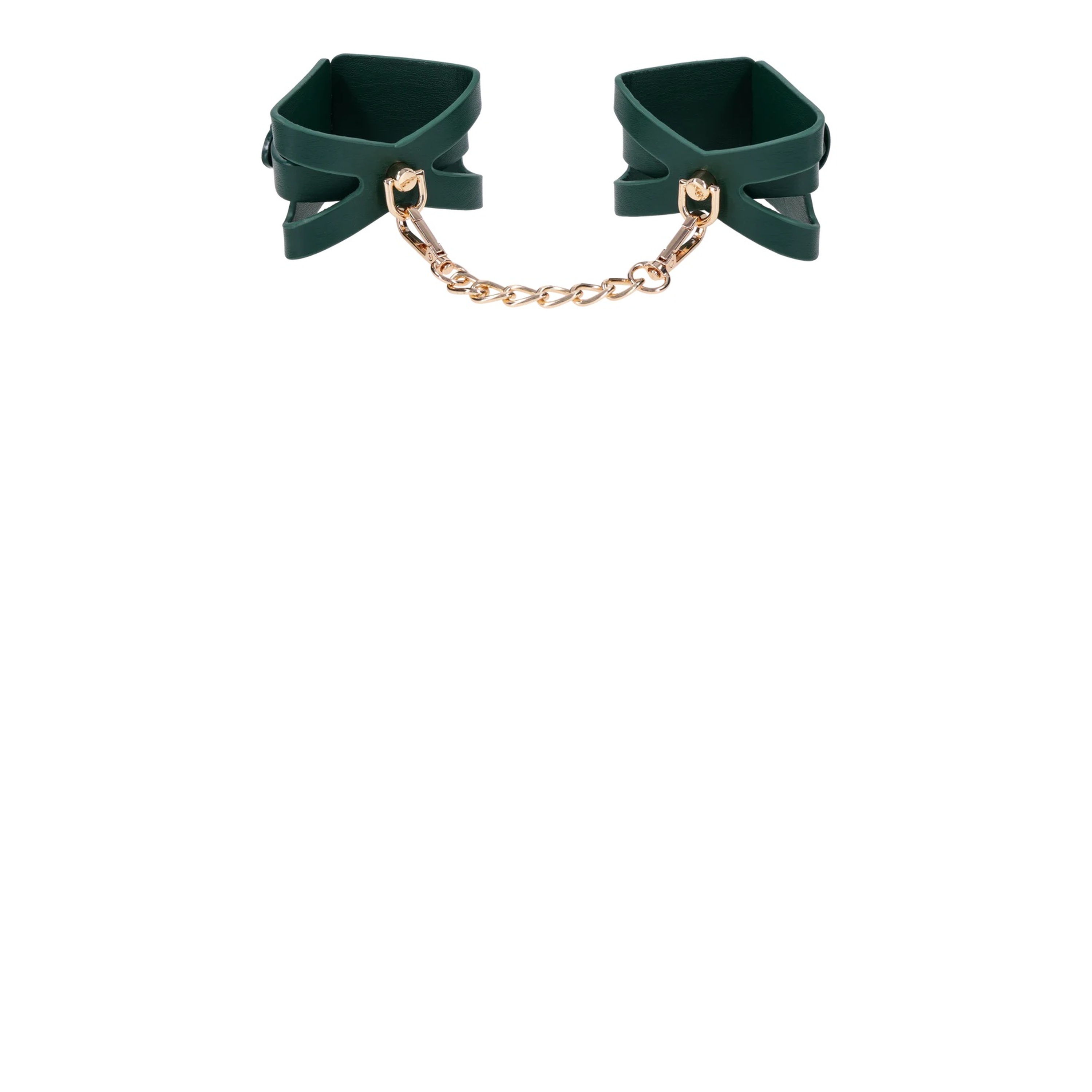 The plush lining ensures comfort during extended wear, while premium gold-toned chain and hardware elevate the overall presentation. Versatile in application, they secure wrists independently or integrate seamlessly with other Indica collection pieces for cohesive bondage play. A sophisticated choice for those seeking both visual impact and tactile pleasure.