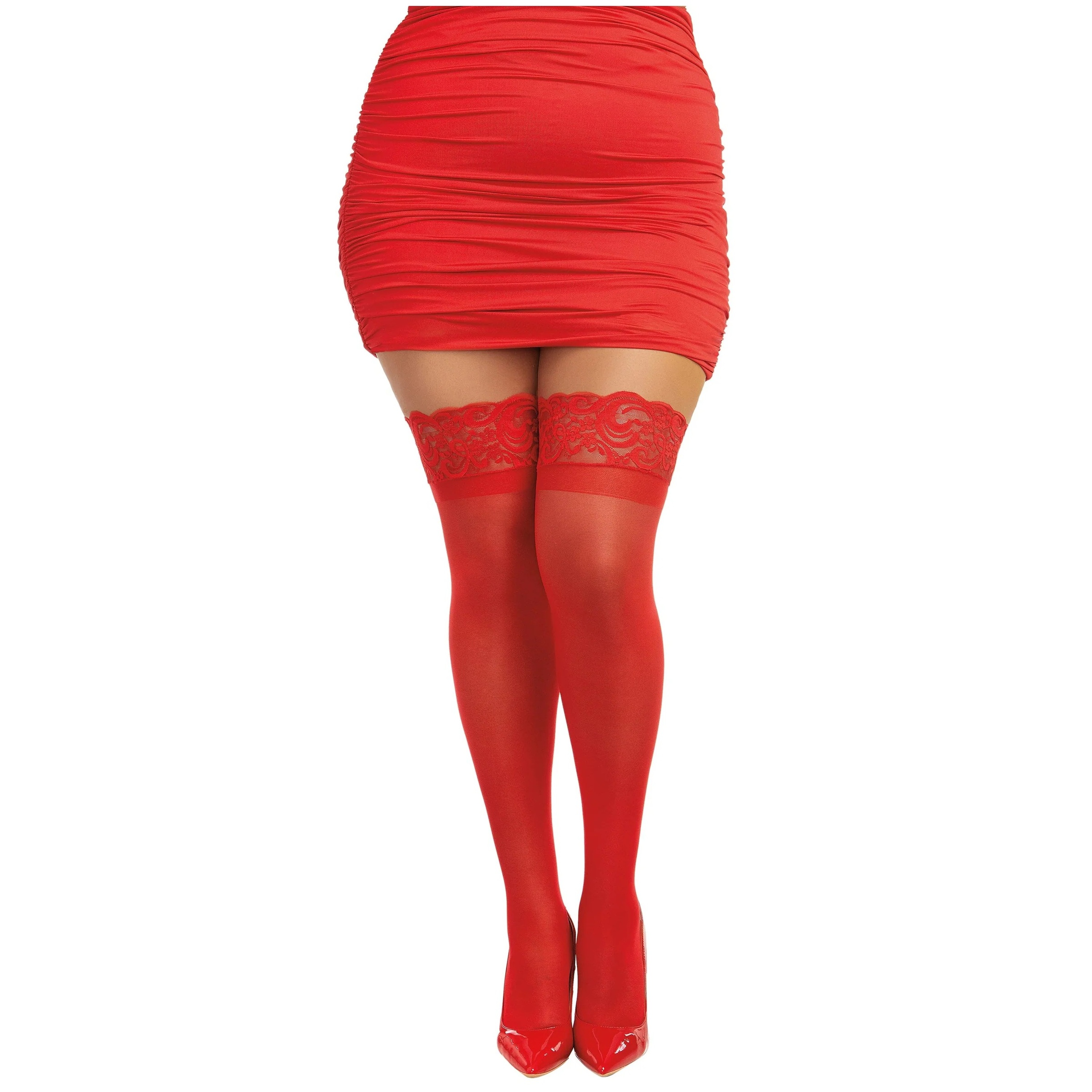 Complete your sexy ensemble in these sheer thigh high stockings featuring a stay-up silicone lace top. (Thong not included.)